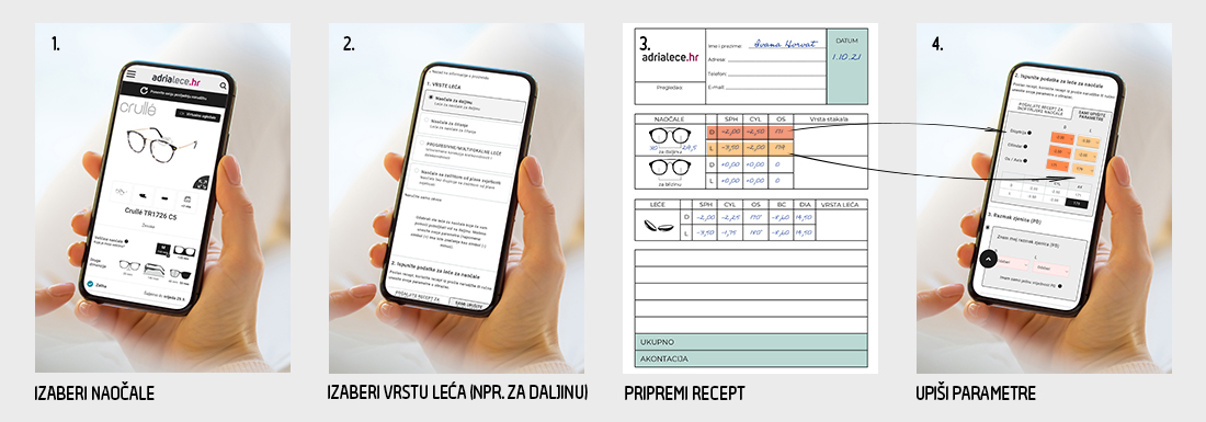 U ovom koraku možete izabrati recept iz prošle narudžbe, poslati recept za dioptrijske naočale ili sami upisati parametre. Ako sami upisujete parametre, provjerite vrijednosti dioptrije, cilindra (ako ga imate) i osi (ako je napisana na receptu). U slučaju da nemate astigmatizam, na receptu ćete imati samo vrijednost dioptrije, a za ljude koji pate od astigmatizma, bit će napisane vrijednosti cilindra i osi.